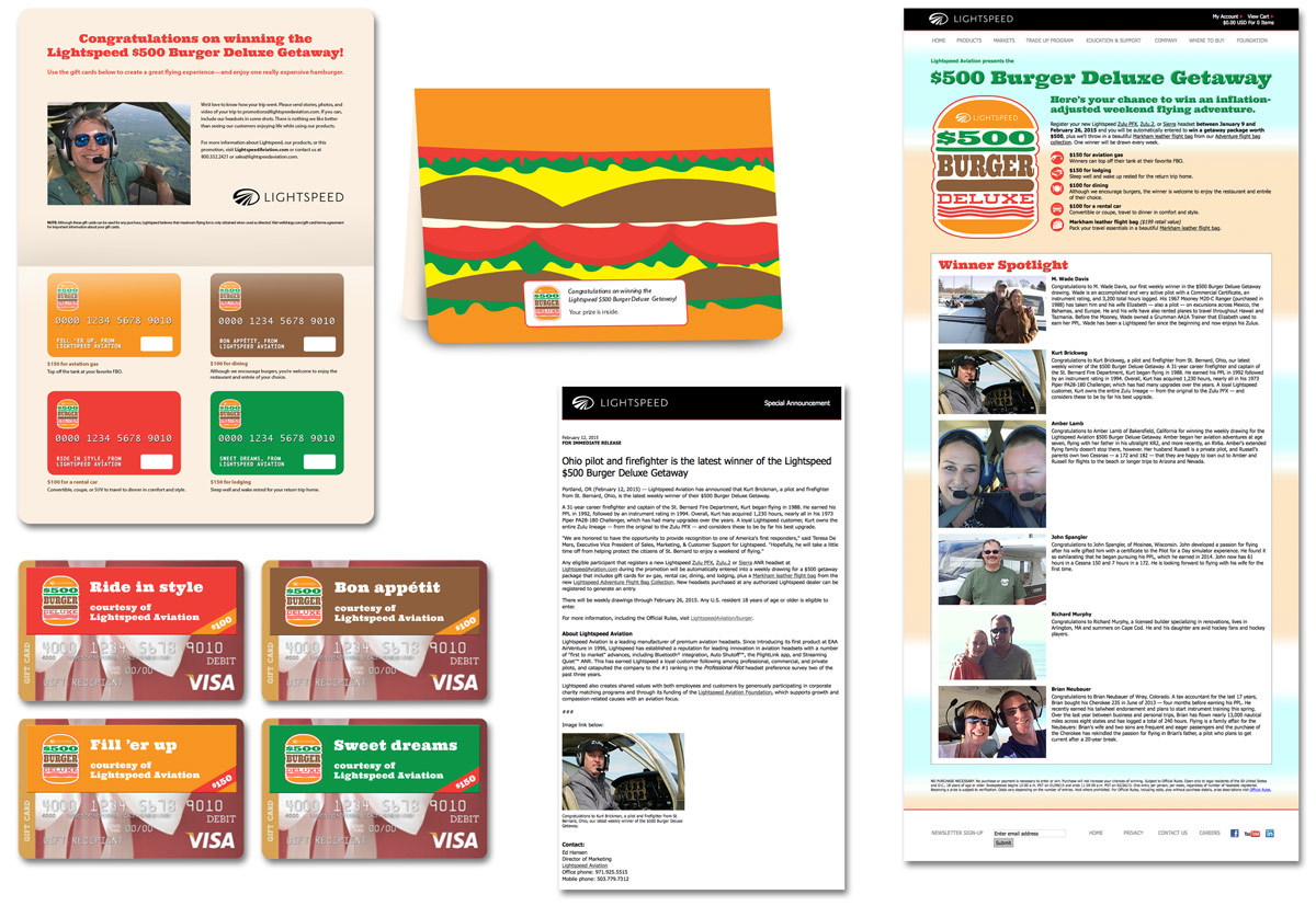 An expansion on the “$100 Burger,” a round-trip flight taken to have a burger and fly home (for about $100 in fuel), this promotion was a weekly drawing for a prize of $500 in prepaid credit cards. The goal was boost sales and promote registrations. Deliverables included a folded card that held the four cards for each winner, a press release, and a landing page with each week’s winners.