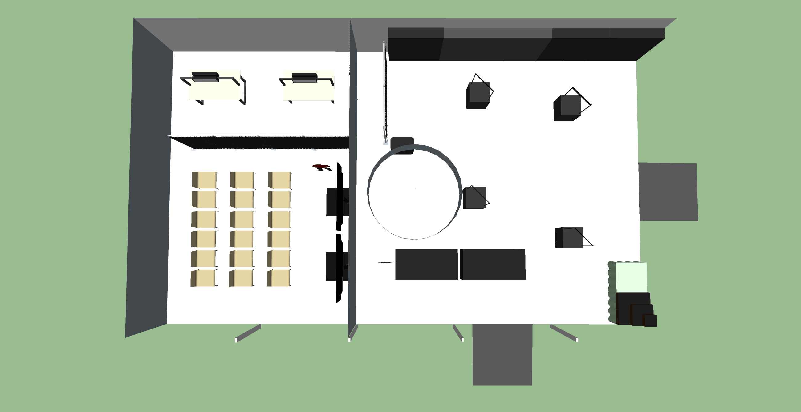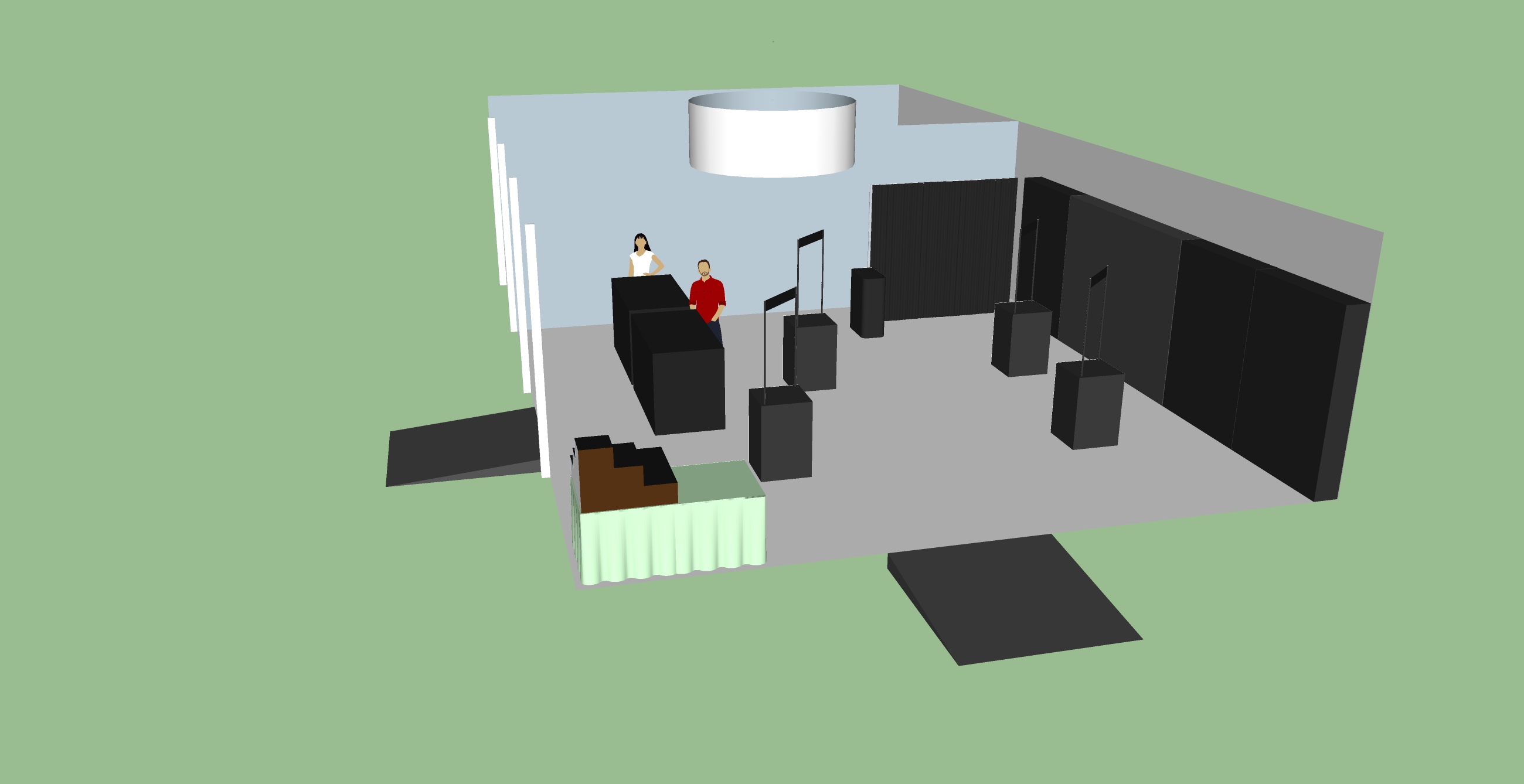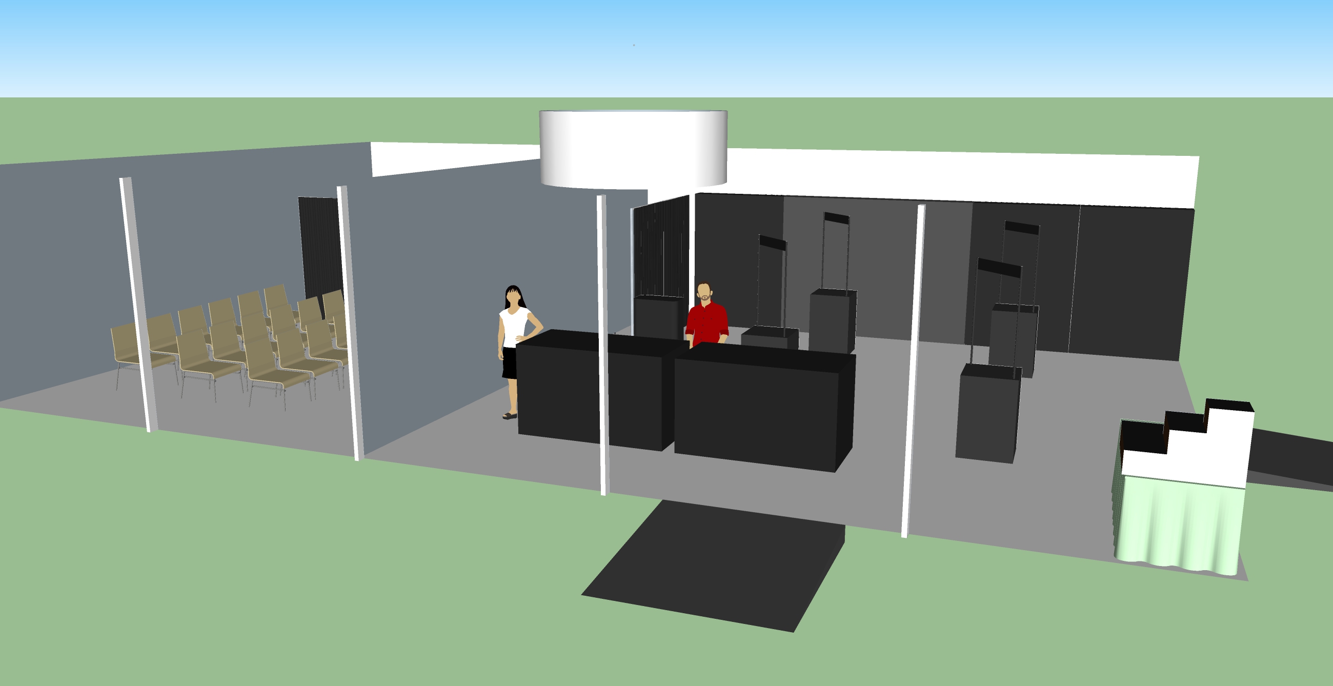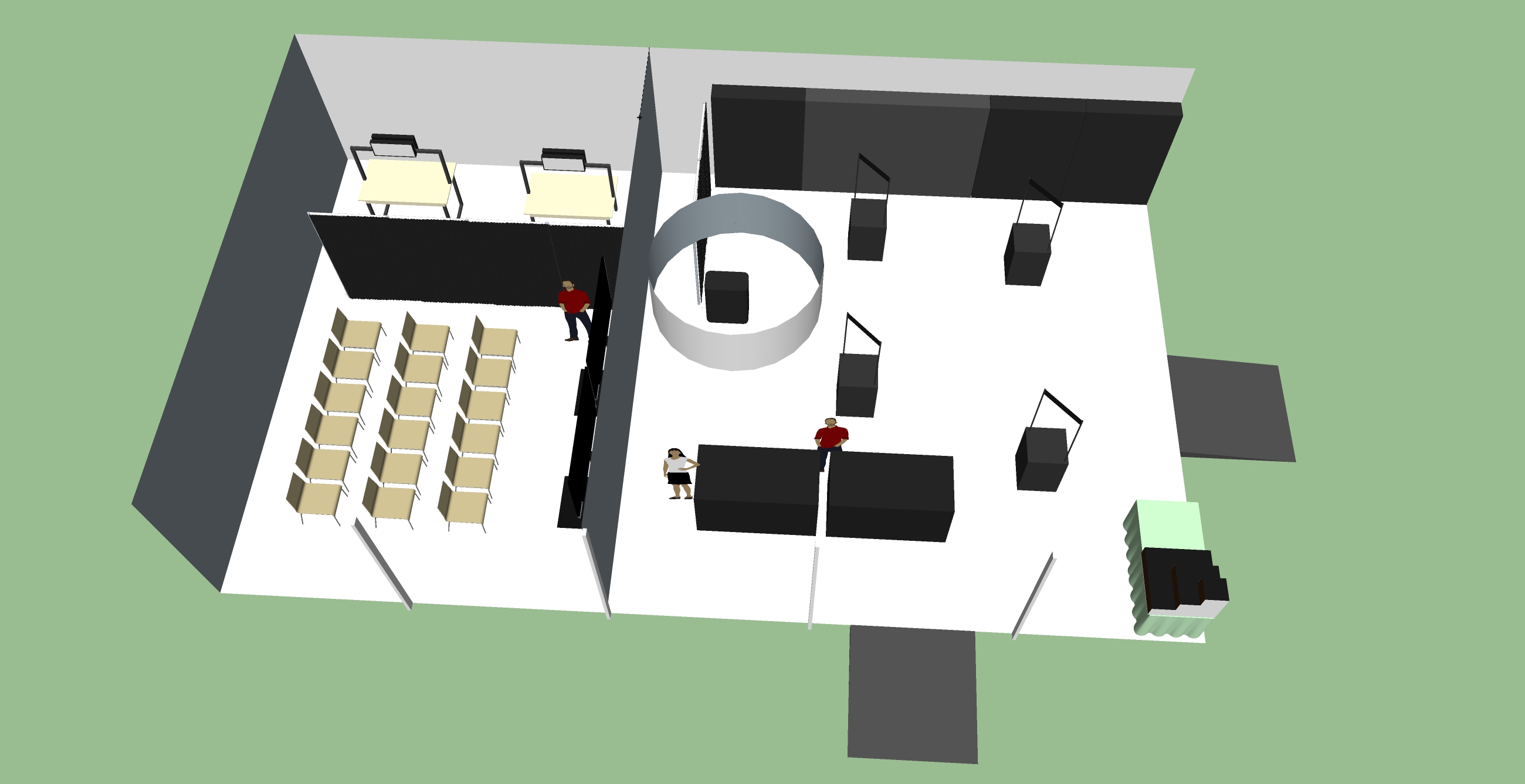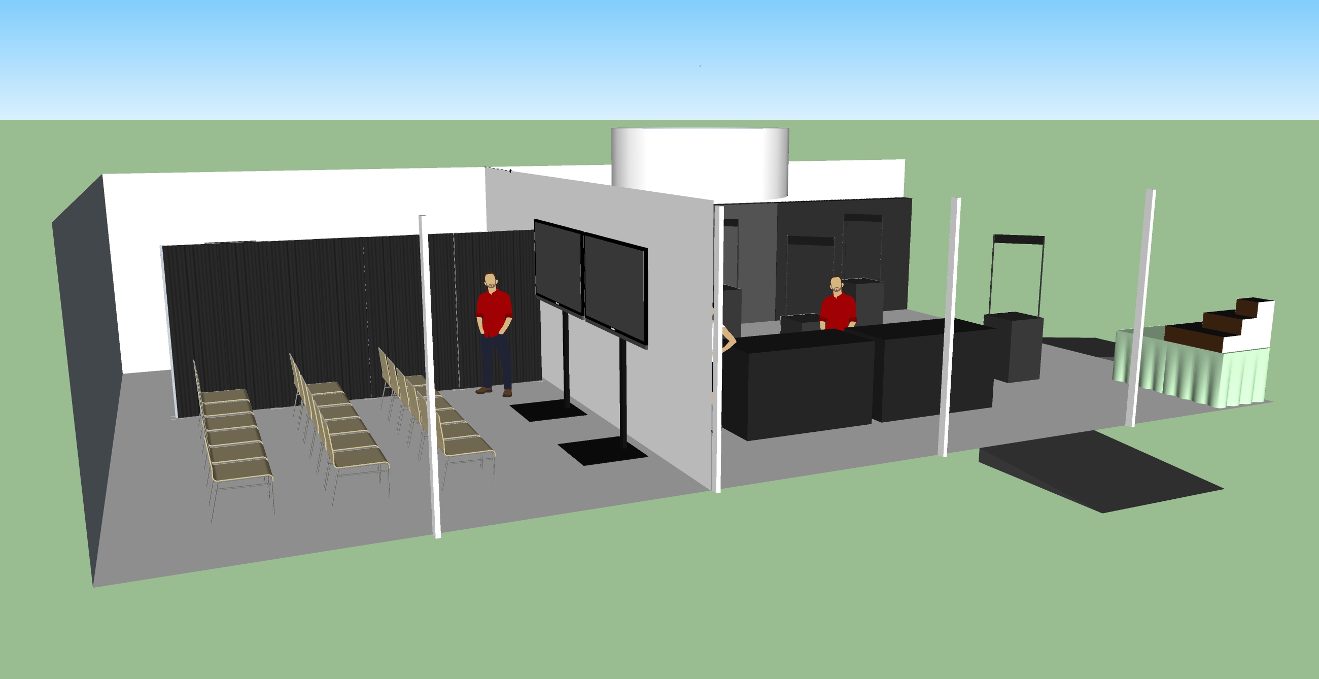 I built this Sketchup model with input from the AirVenture planning committee to accommodate a theatre experience with scheduled video showings followed by a “leave through the gift shop” exclusive demo experience.
