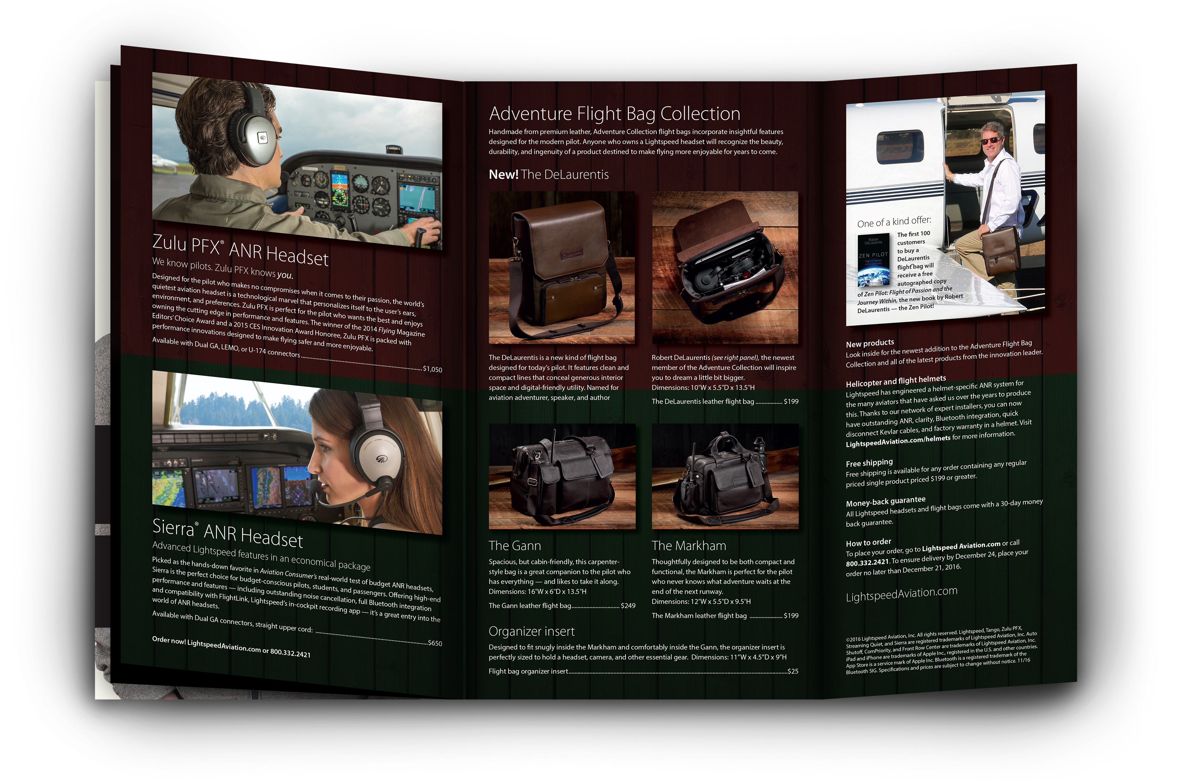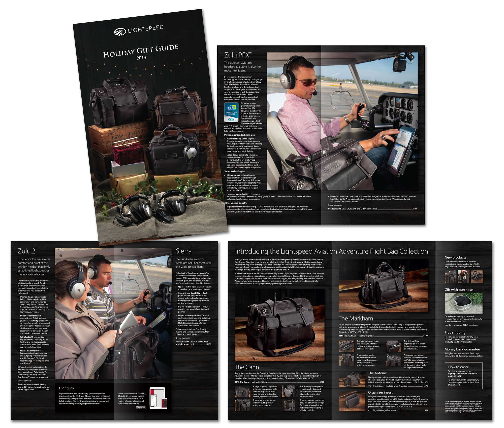 The 2014 Lightspeed Holiday Gift Guide was the first time Lightspeed had made a direct mail catalog. The goal was to sell more headsets for the holidays, but also to launch our new line of leather flight bags. I researched sizes and weights for mailing as cheaply as possible while avoiding using adhesive tabs to close the saddle-stitched catalog. (I solved it by creating a gatefold flap that was fugitive-glued shut for mailing.) I sketched out the layout, then directed a studio photo shoot that included the flight bag product shots and the cover photo. The bump in sales that year was enough that catalogs were sent to larger mailing lists for the following two years.