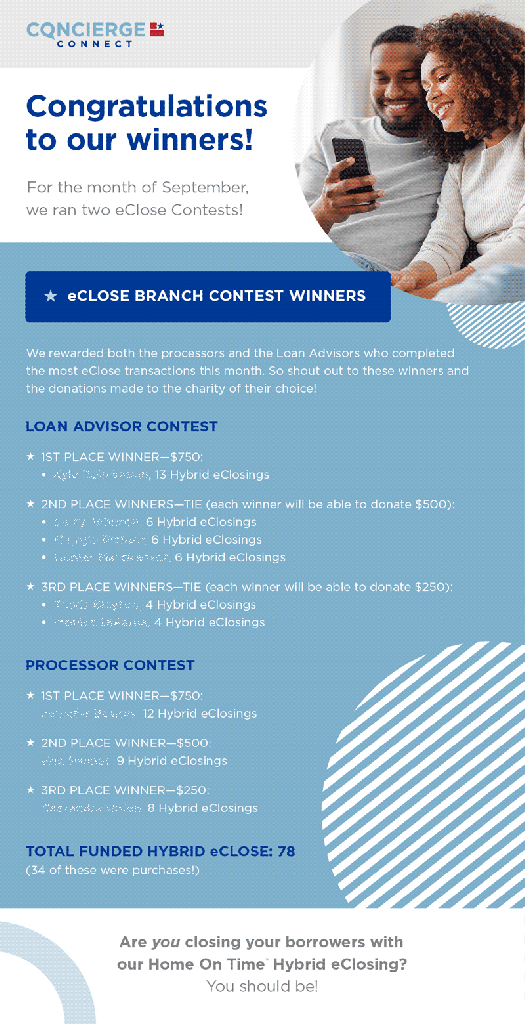 Internal contest emails Type: Email Design This series of internal emails was sent to loan origination teams to encourage the use of hybrid eClose transactions. (Winner names obscured below.) Related