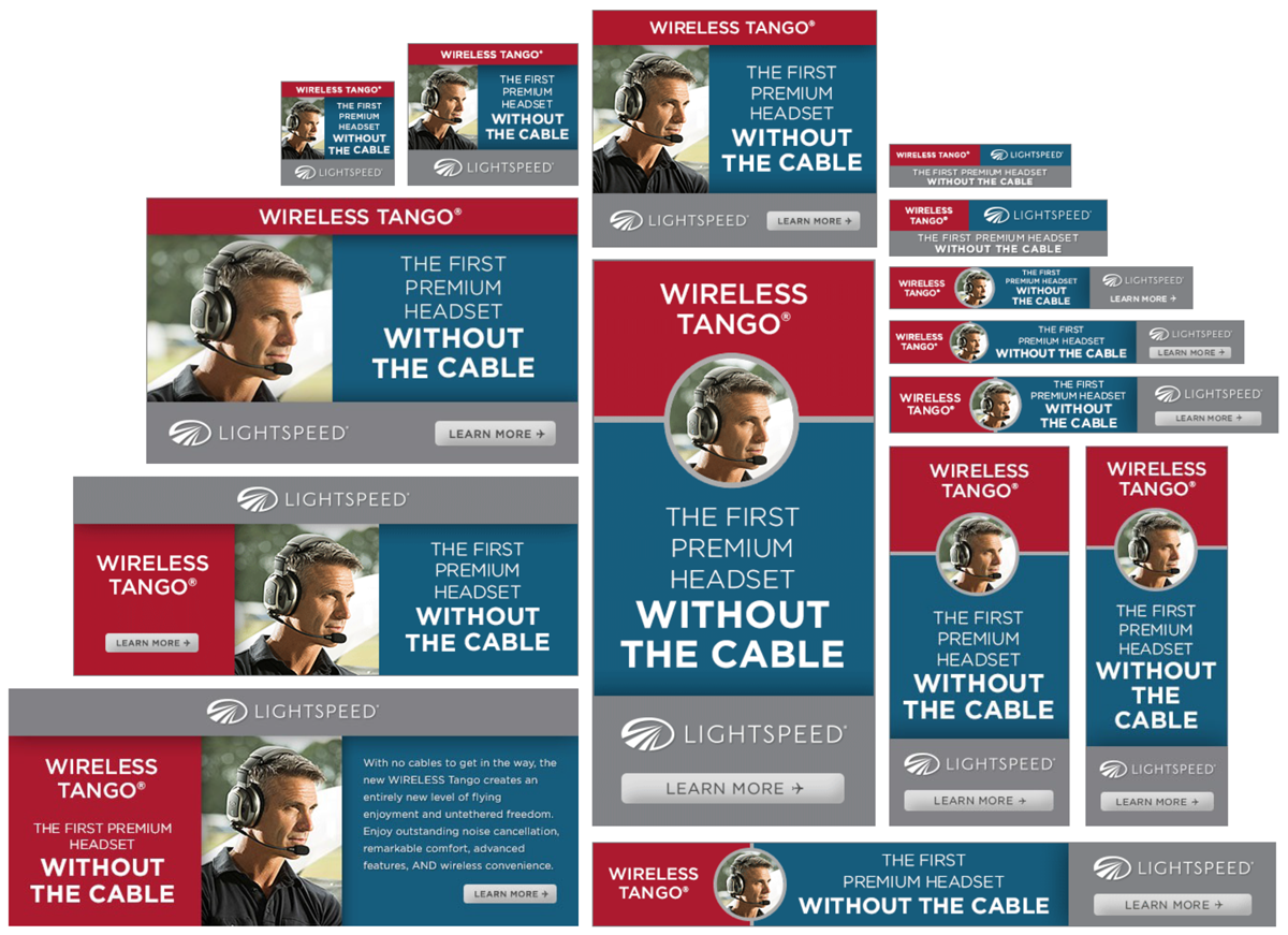 These web banners were used for paid advertising, following the ad specifications for 7 vendors. These were created for a refresh of a product marketing campaign, emphasizing the key differentiator about the headset (wireless) and encouraging pilots to learn more about it.